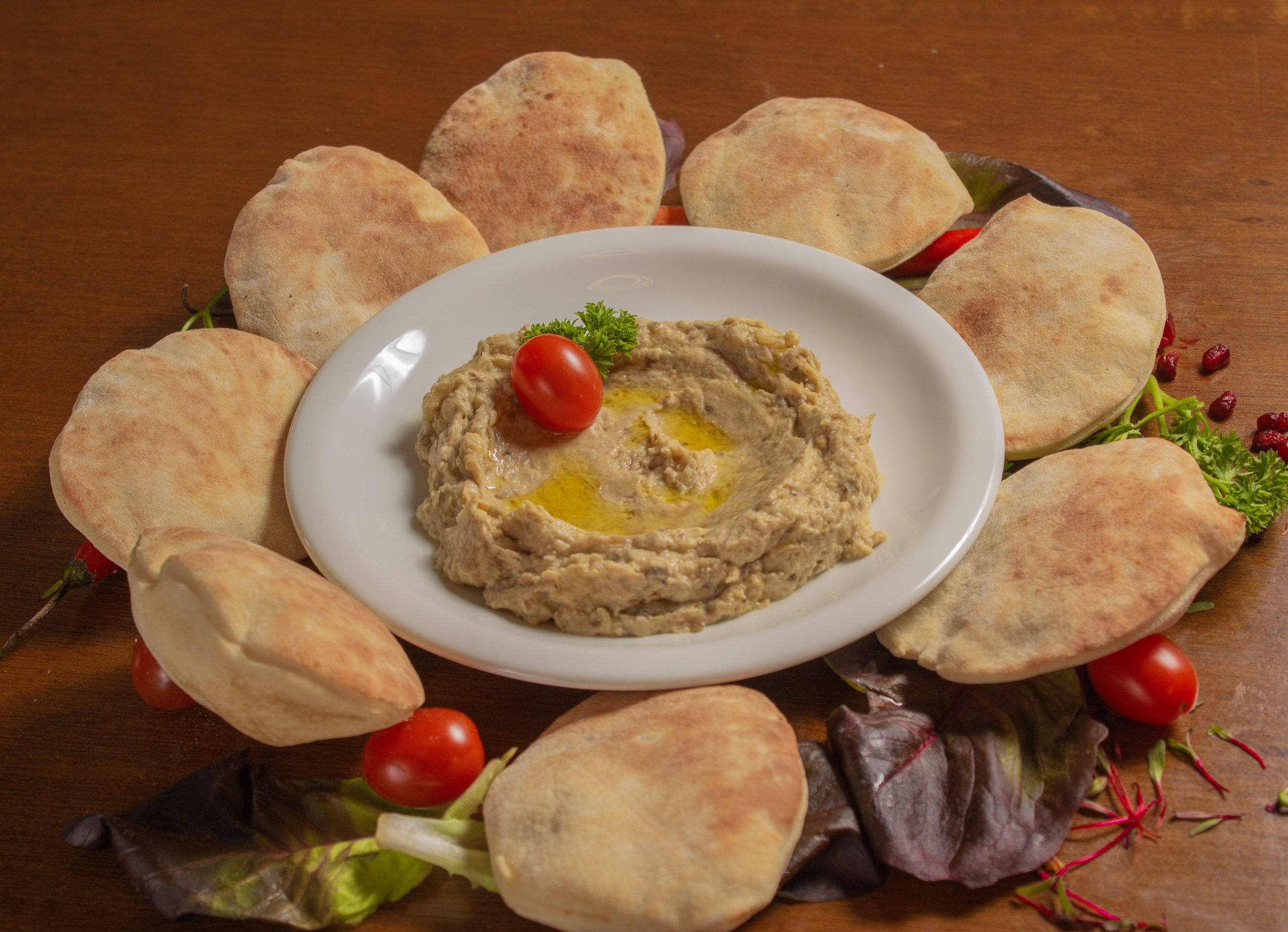 200g pasta de berinjela temperada com tahine e limão, acompanhada de 8 mini pães sírios.