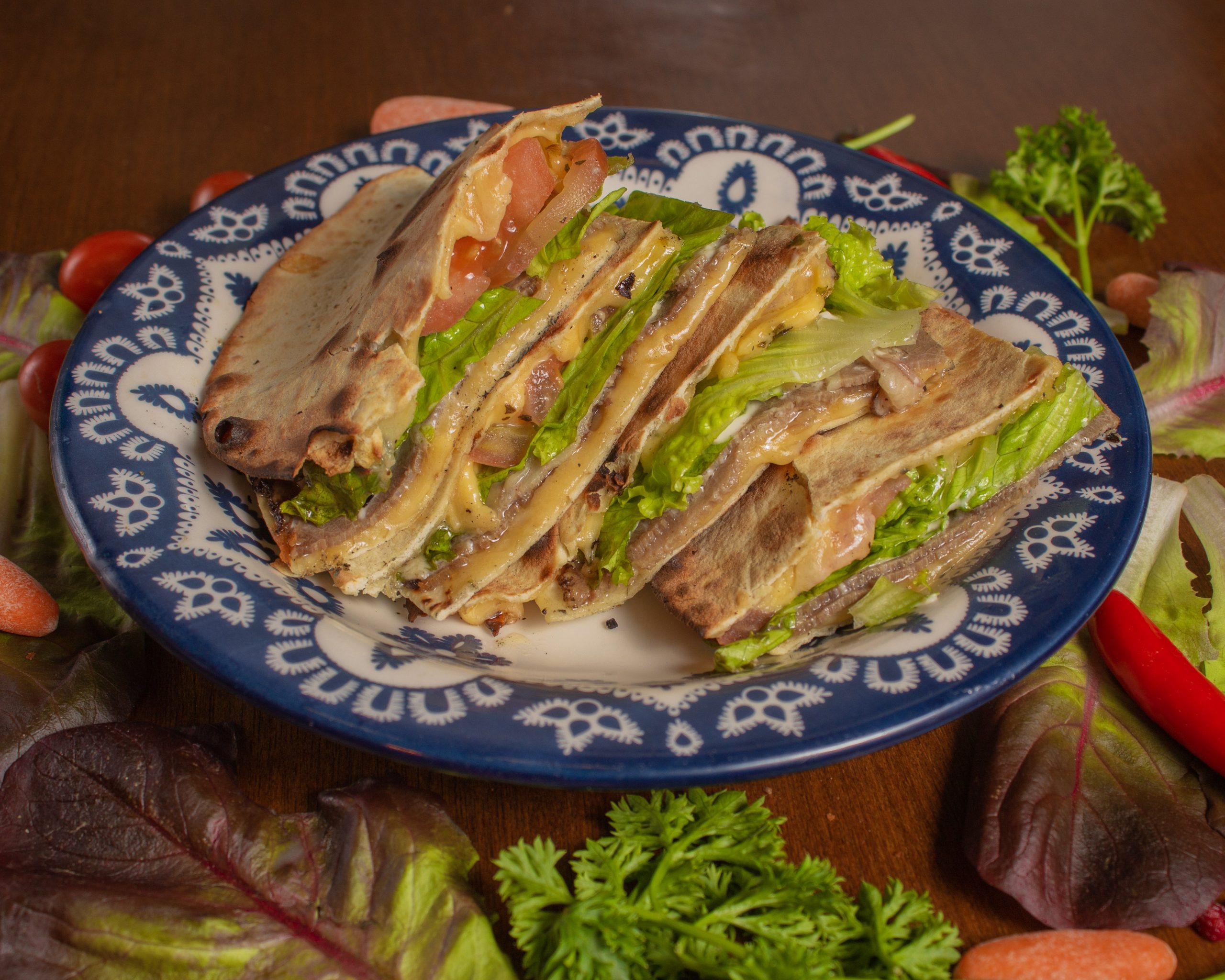 Pão sírio, rosbife, queijo prato, alface americana, tomate, maionese e orégano.
