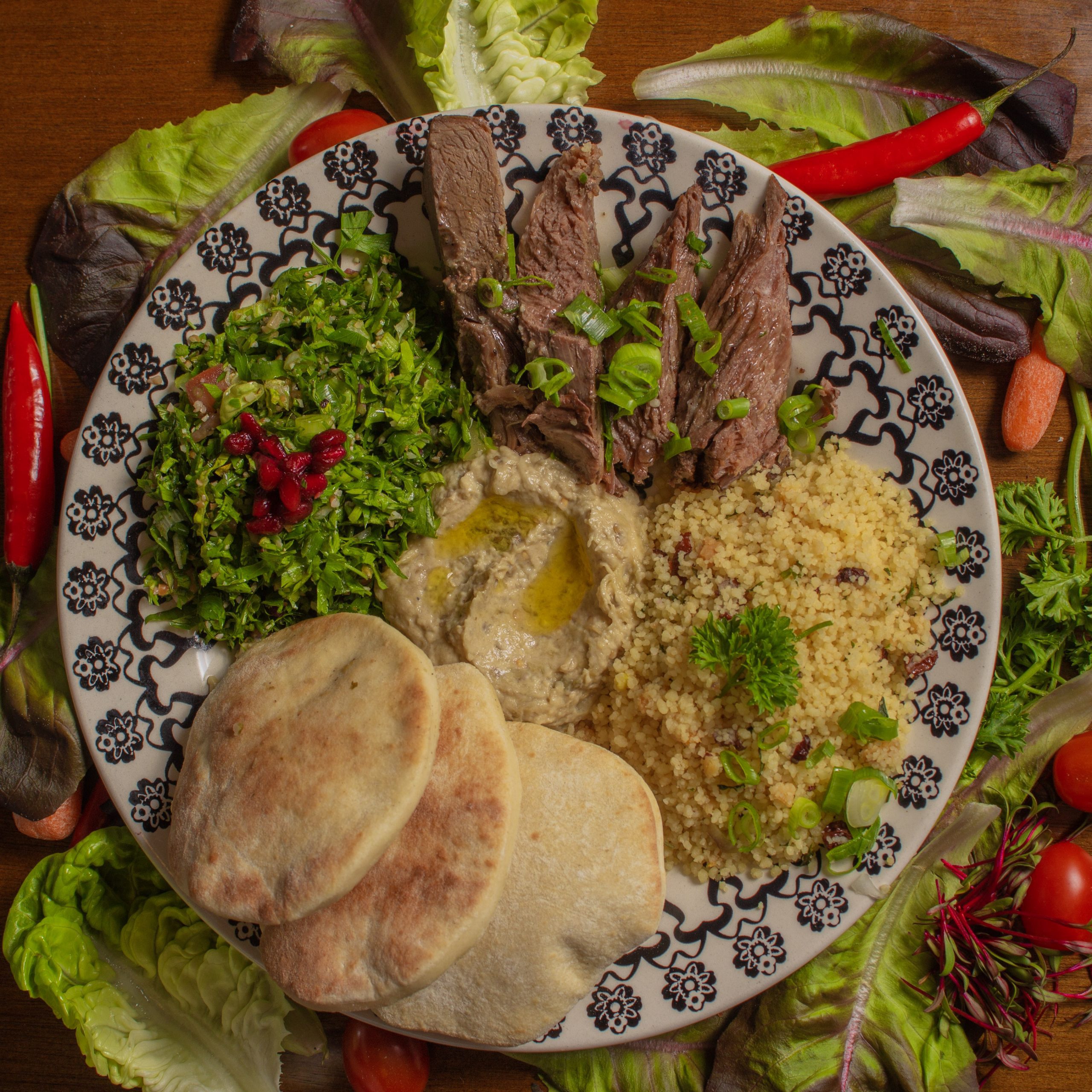 100g de Cordeiro Assado, 100g de Babaganuche, 70g de Cuscuz Marroquino, 70g de Salada Tabule e 3 Mini Pães Sírios.